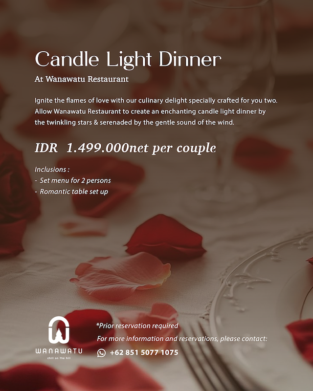 Indulge in the ultimate romantic experience at Wanawatu Restaurant, where every moment is illuminated by the soft glow of candlelight against a backdrop of breathtaking views. Immerse yourself in an evening of culinary delights, intimate ambiance, and the beauty of the surroundings that make your candlelight dinner truly unforgettable.